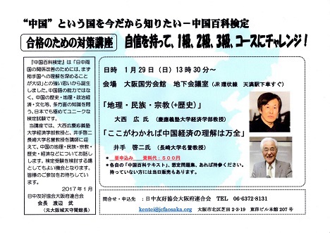 大阪での、中国百科検定合格のための受験対策講座を下記のとおり開催します。