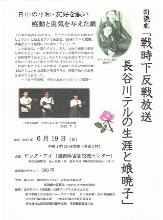 第64回関西エスペラント大会の公開プログラムとして、長谷川テル女史の戦時下反戦放送の「朗読劇」が上演されました。これは、昨年7月に日中友好協会大阪府連が上演したものの再演で、取り上げていただいたことに感謝して、日中友好協会大阪府連合会を代 表して山本恒人副会長が「長谷川テルを支えたエスペランチスト群像」と題する挨拶を行いました。この文章は、それを加筆・整理したものです。