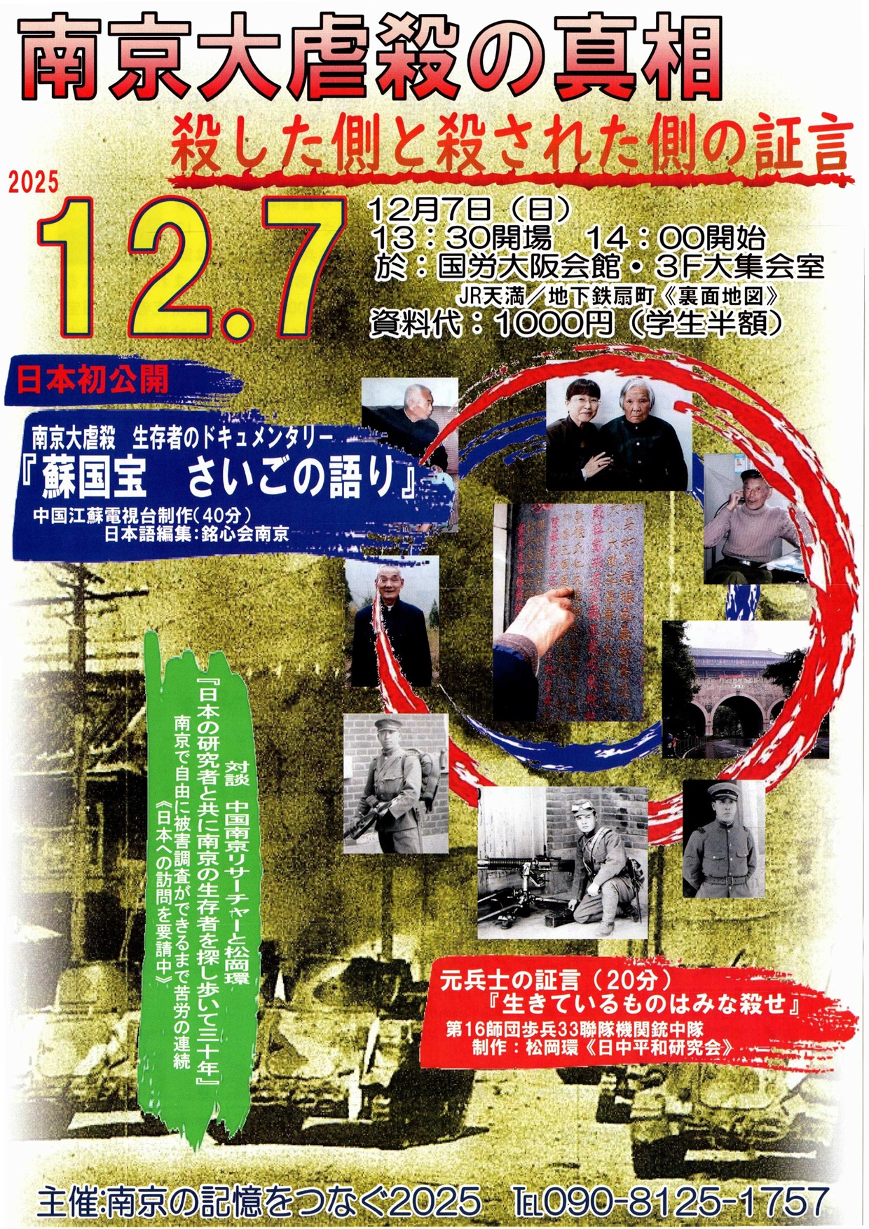 南京の記憶をつなぐ2025は12月7日に集会を行います。江蘇省の江蘇電視台制作の南京大虐殺を記録するドキュメンタリー映画から今年は、南京大虐殺生存者の「蘇国宝 最後の語り」と「元日本兵士の証言」の2本を上映します。日本語字幕はついてます。ご参加ください。