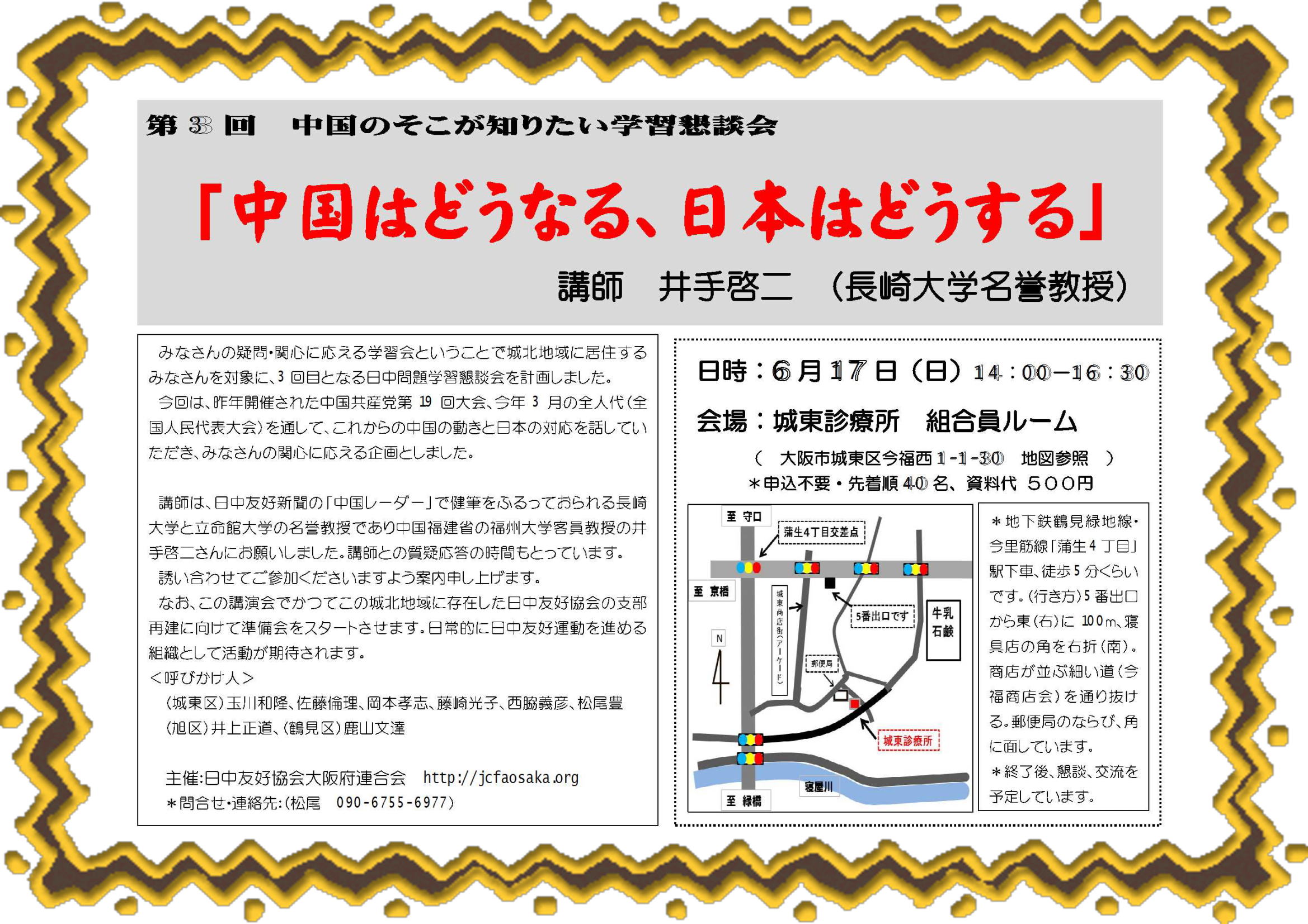 6/17(日)に大阪市内の城北地域で、第3回中国のそこが知りたい学習懇談会「中国はどうなる、日本はどうする」を開催します。