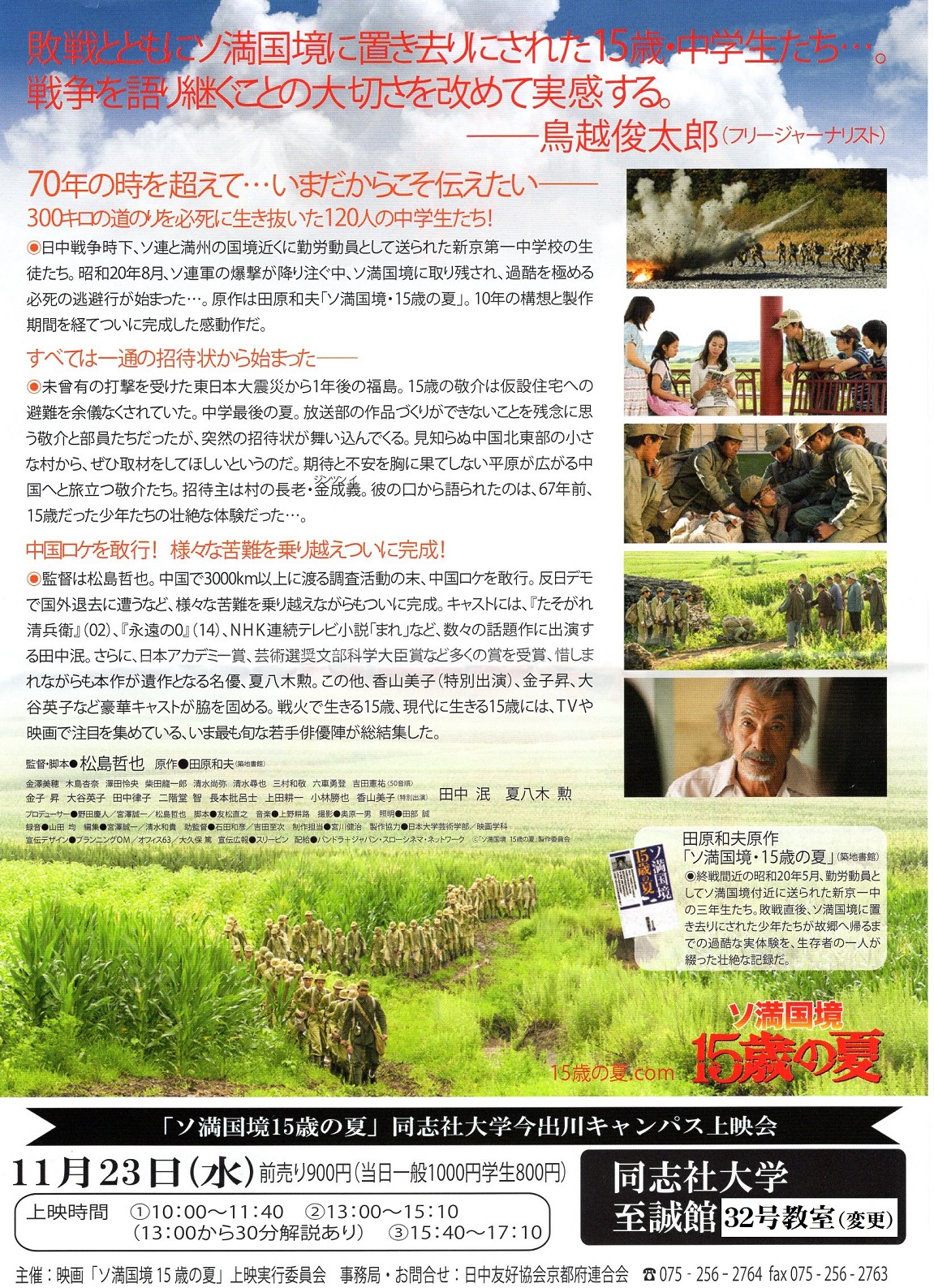 映画「ソ満国境 15歳の夏」の上映会が、京都・同志社大学今出川キャンパスで11/23(水)に3回上映で開催されます。日中友好協会京都府連などでつくる実行委員会の主催です。