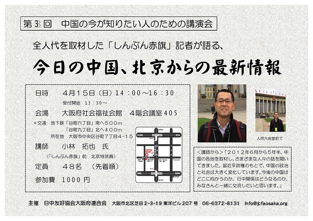 ぶん赤旗」記者、前北京特派員の小林拓也さんから、5年半にわたる取材経験、大きく変化している中国の政治と社会を語っていただきます。今後の中国はどこに向かうのか、日中関係はどうなるのかをご一緒に考えるため4/15、14:00から講演会を企画しました。チラシ、ここをクリック
