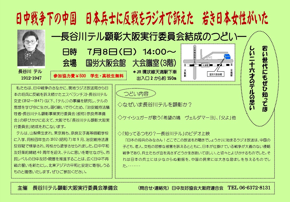 日中戦争のさなかに、現地ラジオ放送局から日本の将兵に反戦を訴え続けたエスペランチスト長谷川テル女史(1912―1947)(以下、「テル」)の事績を研究し、テルの思想を学び今に生かし語り継いで行くため、「治安維持法犠牲者・長谷川テル顕彰事業実行委員会(仮称)奈良県準備会」の呼びかけに応えて、大阪でも長谷川テル顕彰の実行委員会の結成をおこないます。名称は、「大阪・長谷川テル顕彰の会」