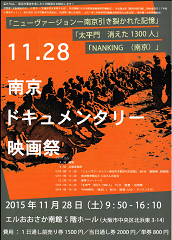 12月13日(1937年)は南京大虐殺事件記念日です。安倍政権や一部のメディアなどによって「虐殺はなかった」、「誇大視している」などという歴史歪曲キャンペーンが長く続いている現在こそ、私たちは歴史と事実とを直視しなければなりません。南京事件を掘り下げて取り組んでいる諸団体が、この11月28日に「南京ドキュメンタリー映画祭」を開催します。「南京事件」をふりかえる大切な機会です。多くの方のご鑑賞を(前売り鑑賞券1500円取り扱い中)。