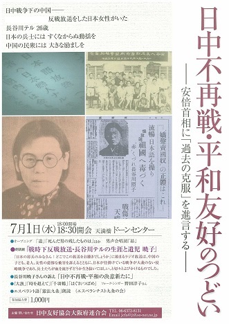 第64回関西エスペラント大会の公開プログラムとして、長谷川テル女史の戦時下反戦放送の「朗読劇」が上演されました。これは、昨年7月に日中友好協会大阪府連が上演したものの再演で、取り上げていただいたことに感謝して、日中友好協会大阪府連合会を代 表して山本恒人副会長が「長谷川テルを支えたエスペランチスト群像」と題する挨拶を行いました。この文章は、それを加筆・整理したものです。