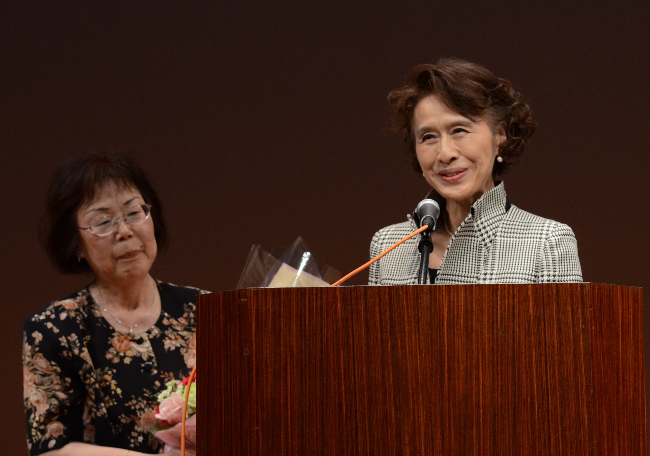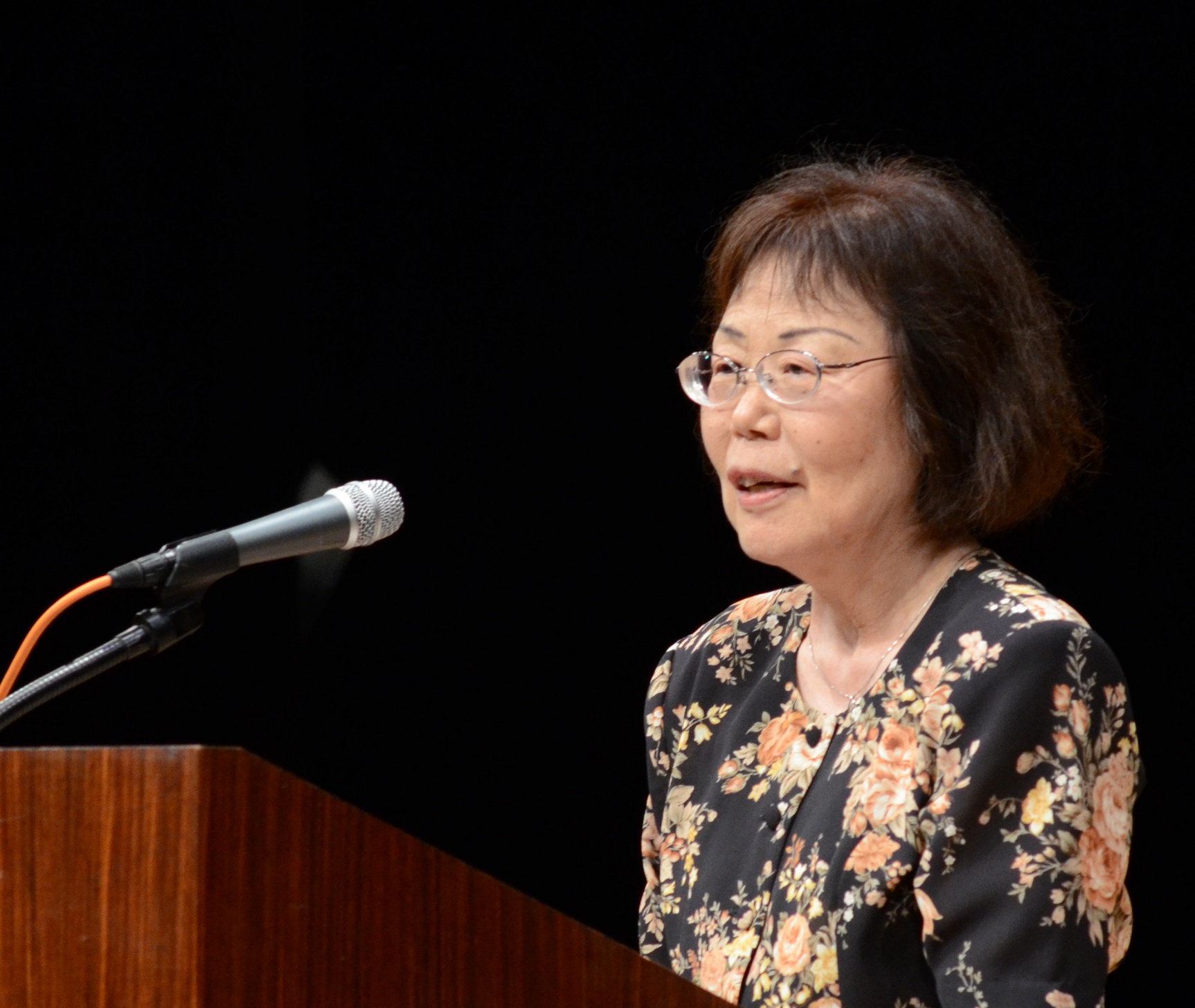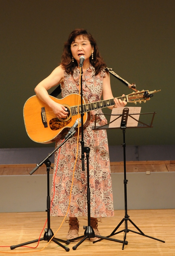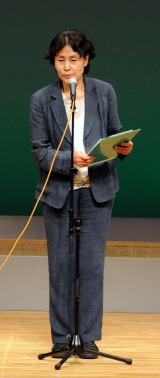 朗読劇の後、1歳の時にテルと死別した遺児・曉子さんが、中国での40年、日本帰国後の27年間、母の国に帰って悔いはなく、多くの人々の好意に支えられたことへの感謝を語りました。歴史に背を向け、戦争に向かう安倍首相を厳しく批判し、噛んで含める言葉に、会場は聞き入りました。