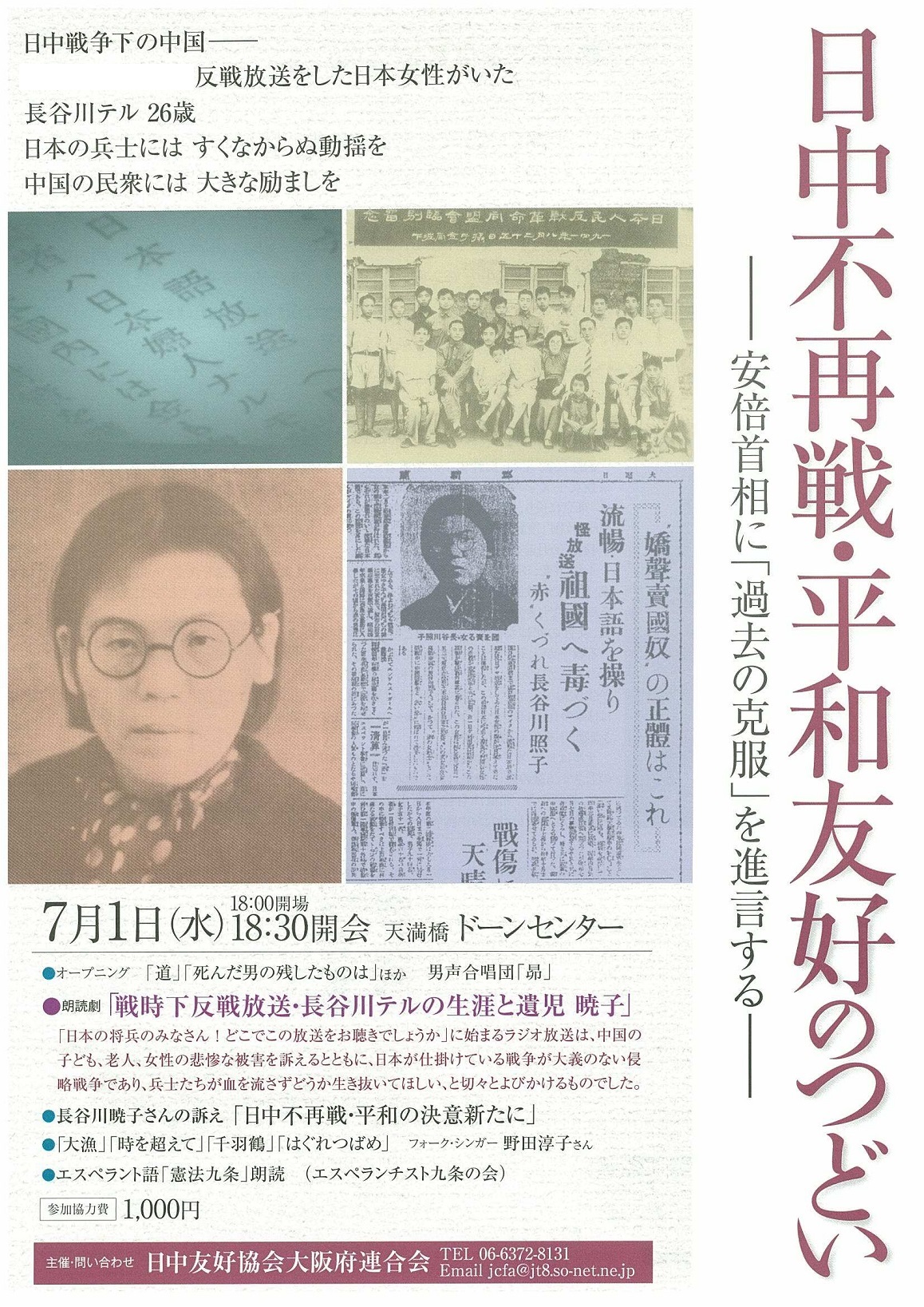 盧溝橋事件記念日を前に、7月1日天満橋のドーンセンターで「つどい」を開催、日中戦争下、反戦ラジオ放送で、 中国内外に大きな共感を与えたエスペランチスト長谷川テルの事績を学ぶ「朗読劇」が披露されました。青年学生の中に日中友好の新たな気運をと、