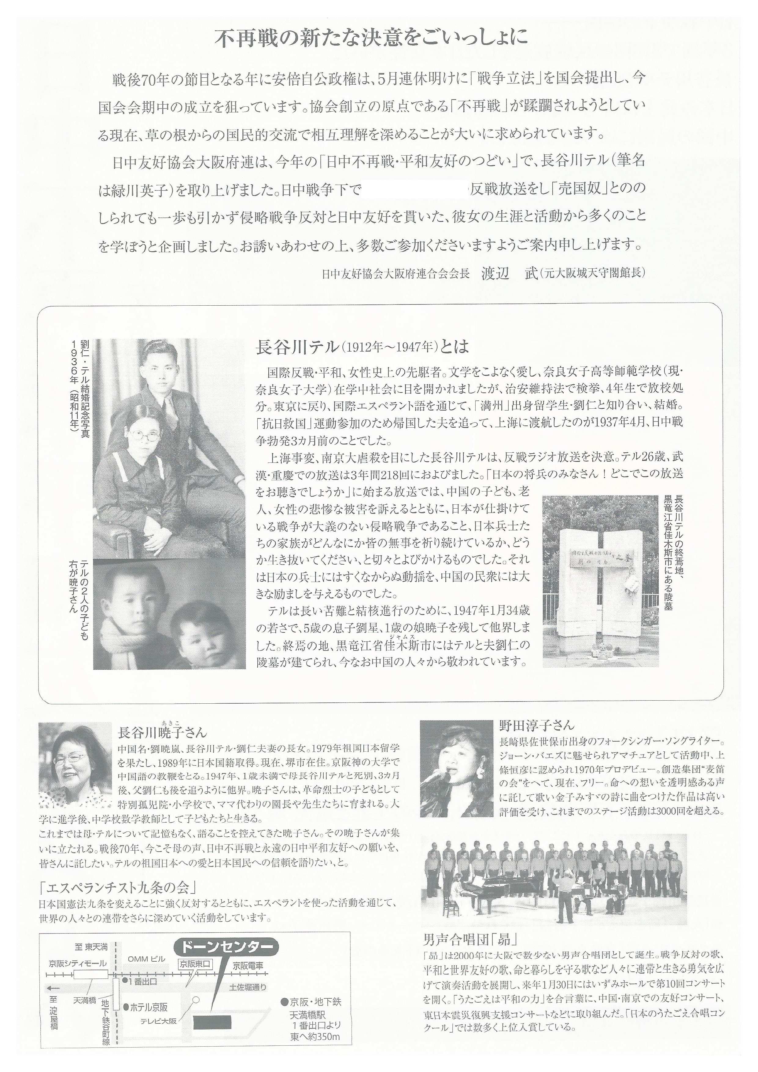 日中友好協会大阪府連は、今年の「「日中不再戦・平和友好のつどい」で、長谷川テル(筆名は緑川英子)を取り上げました。日中戦争下で反戦放送をし「売国奴」とののしられても一歩も引かず侵略戦争反対と日中友好を貫いた、彼女の生涯と活動から多くのことを学ぼうと企画しました。お誘いあわせの上多数ご参加くださいますようご案内申し上げます。