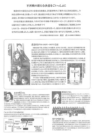 戦後70年の節目となる年に安倍自公政権は、「戦争立法」を国会提出し、今国会会期中の成立を狙っています。協会創立の原点である「不再戦」が蹂躙されようとしている現在、草の根からの国民的交流で相互理解を深めることが大いに求められています。
